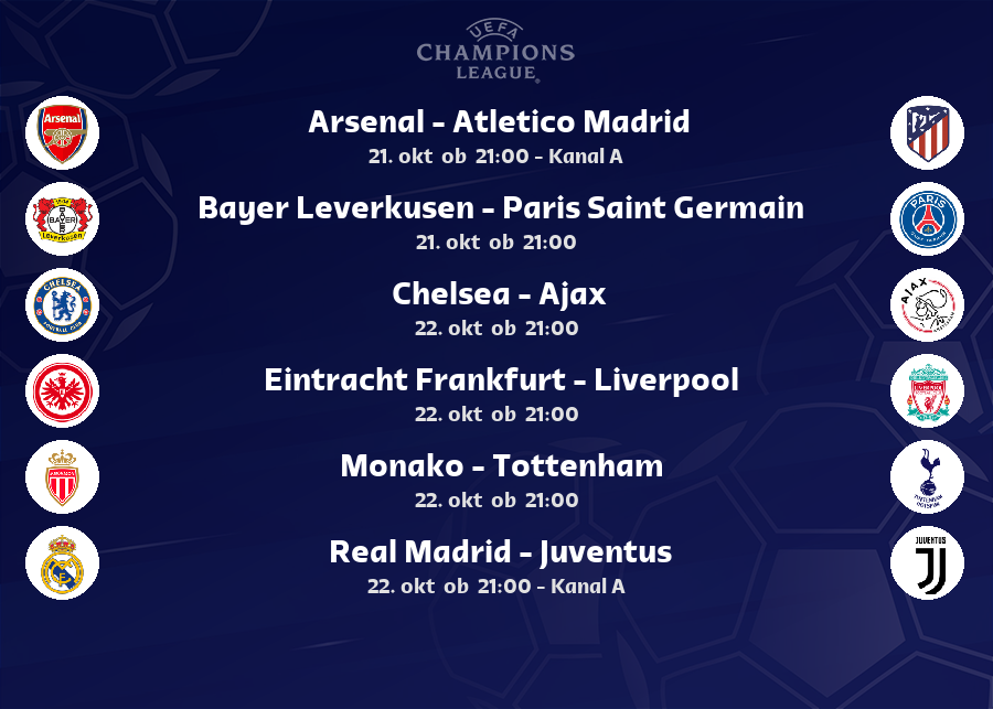 Slovan Bratislava za katero igra Kenan Bajrić bo gostil Manchester City v torek ob 21 Uri, Jan Oblak bo gostoval v sredo pri Benfici tekmo boste lahko gledali na Športklubu 4. Sturm graz za katerega igrata Horvat in Gorenc Stanković bosta v sredo gostila belgijski Brugge. Derbi kola bosta odigrala Arsenal in PSG v torek ob 21 uri, prenos tekme bo na Kanalu a in Voyu.